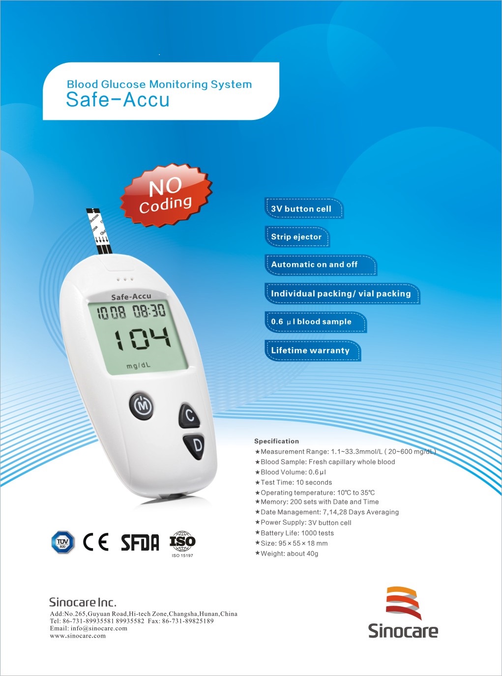 Safe Accu2 is intended for IVD testing the blood glucose in the fresh whole capillary blood and vein plasma; for medical institutes’ fast testing of blood glucose; for diabetics and other groups’ blood glucose monitoring.